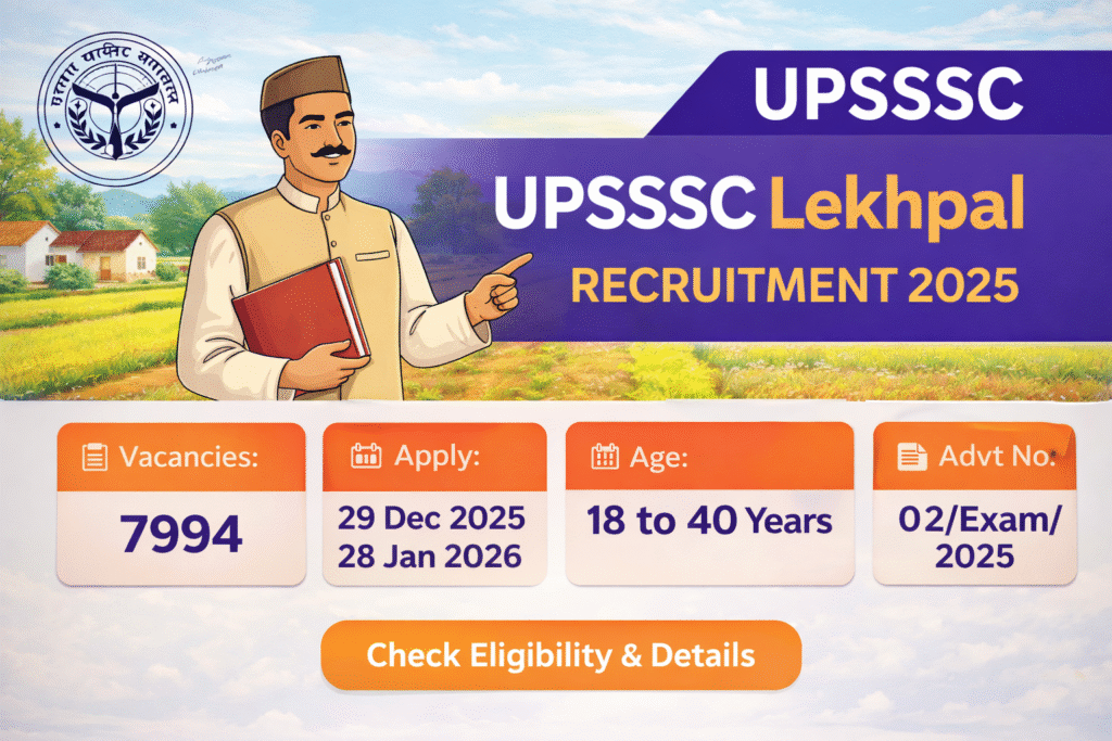The Uttar Pradesh Subordinate Services Selection Commission (UPSSSC) has published an official notification for the recruitment of Lekhpal posts. A total of 7,994 vacancies are available under this recruitment drive. The online application process will begin on 29 December 2025, and eligible candidates can submit their applications until 28 January 2026.